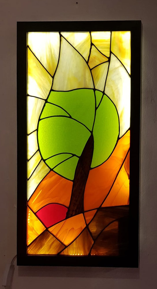 Tree-at-sunset-stained-glass-window Published 26 בינואר 2021 at 544 × 1000 in Tree-at-sunset-stained-glass-window תמונת ויטראז בשילוב תאורת לד מאחור עץ על גבעה כתומה